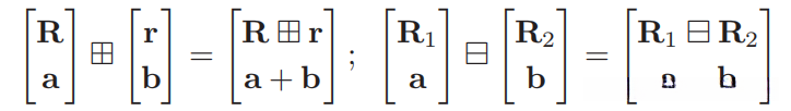 M=SO(3): R\, \boxplus\, r=RExp(r); \! R_1\boxminus R_2 = Log(R_2^TR_1)