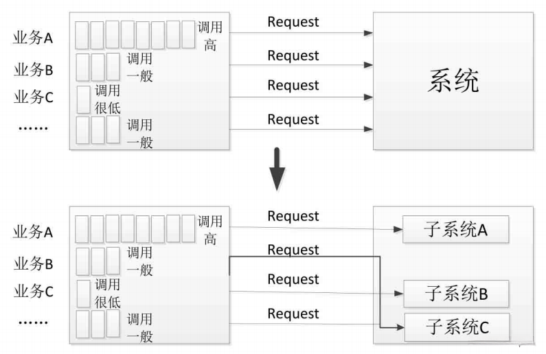 - 在组织架构设计时,则会将具有相近并发程度的业务进行分类处理,并将具有相同功能的产品业务整合到同一个新的子系统中。