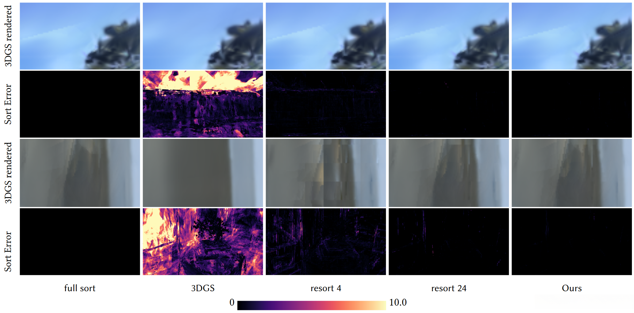For resorting with a window size of 4, tile artifacts are still visible. Our approach hardly diverges from fully sorted rendering, while running 100× faster ; it is also about 5× faster than resort 24 and on average only 4% slower than 3DGS.