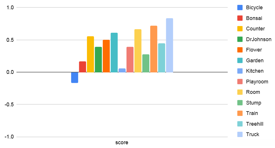 A positive score indicates a preference for our method, whereas a negative score indicates a preference for 3DGS. Our method clearly outperforms 3DGS.
