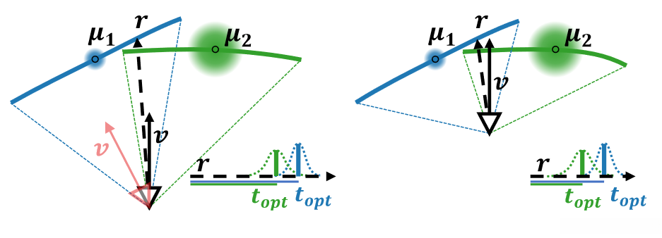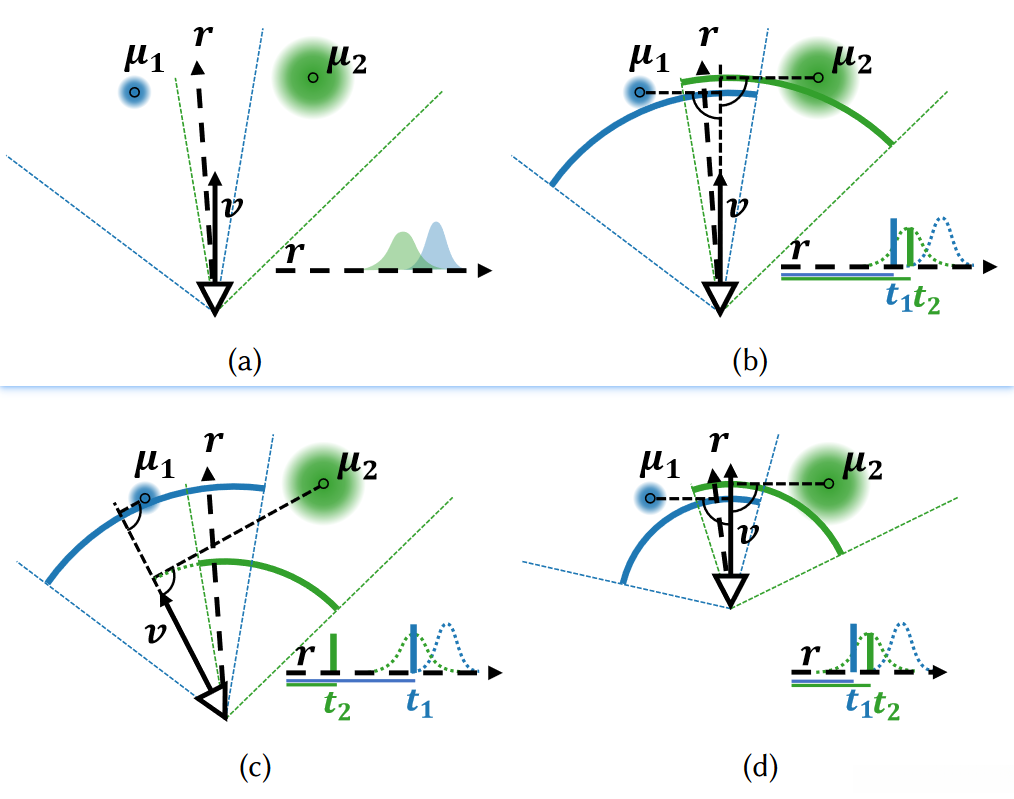 ) puts 2D splats on spherical segments around the camera, inverting the relative positions of the two Gaussians along the example view ray.