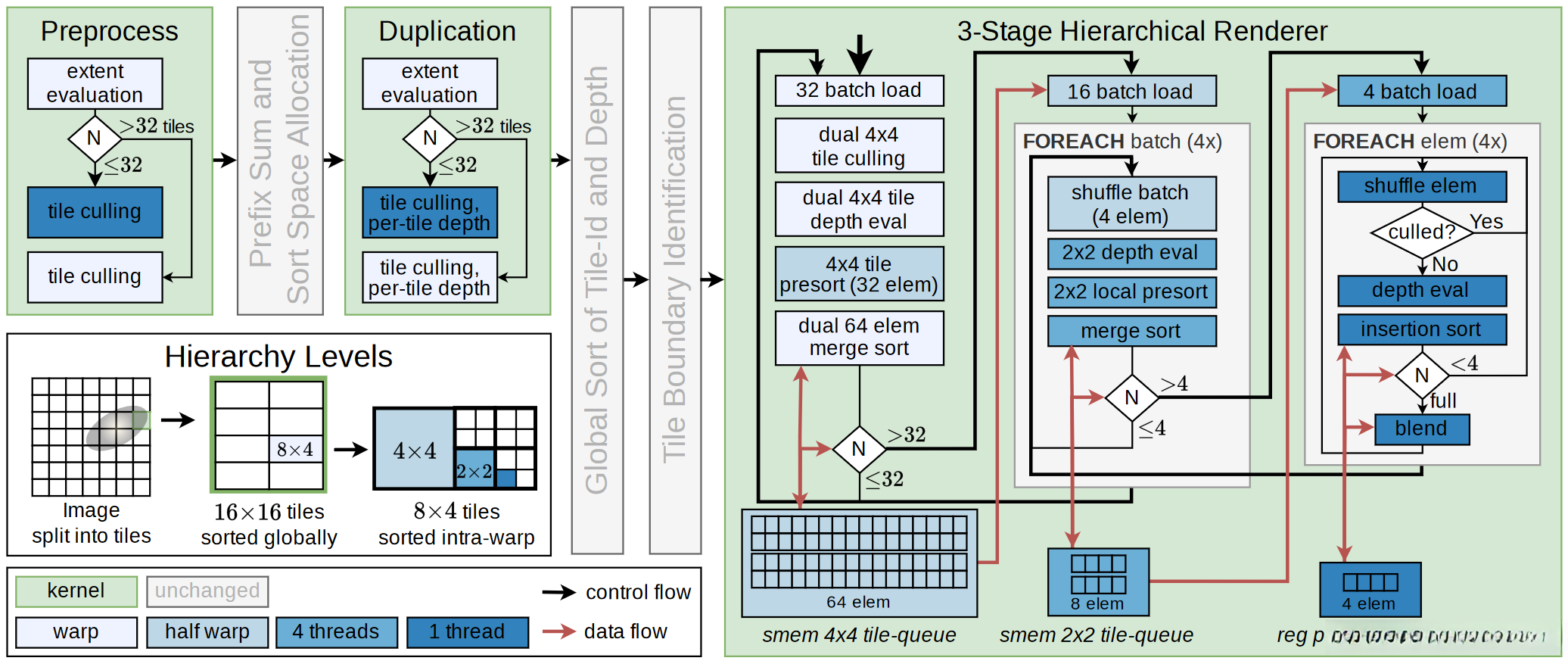 We add** load balancing, tile culling and per-tile depth evaluation** to the first two stages of 3DGS.