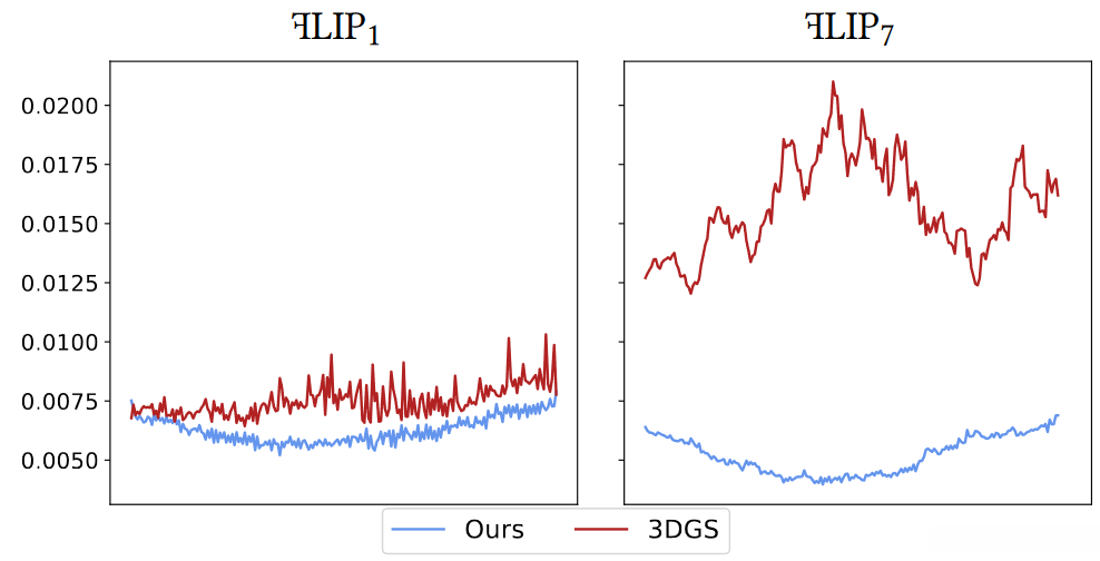 Per-frame F LIP𝑡 scores for 𝑡 ∈ {1, 7} for a complete video sequence from the Garden scene. Popping in 3DGS causes significant peaks , as can be seen in the results for F LIP
