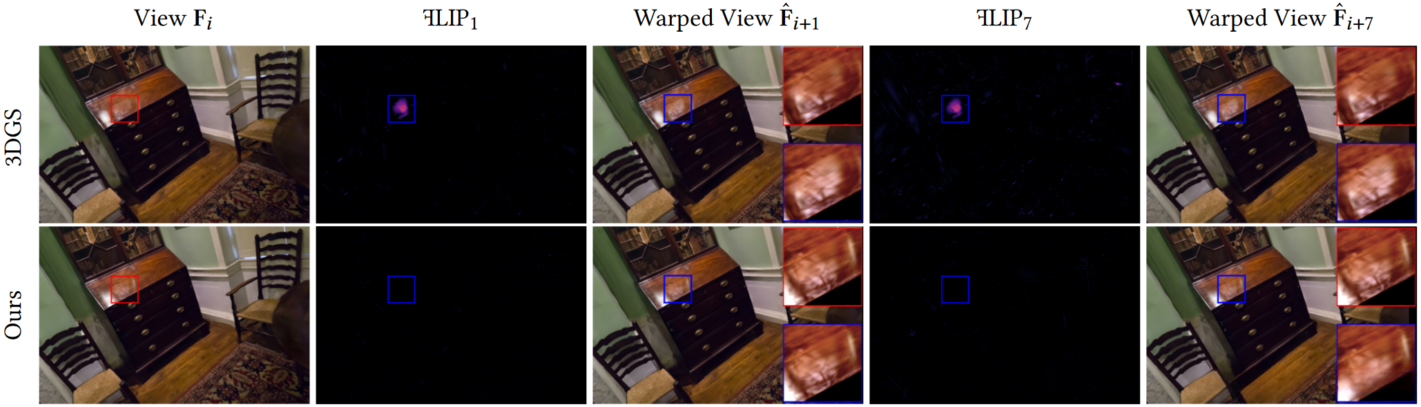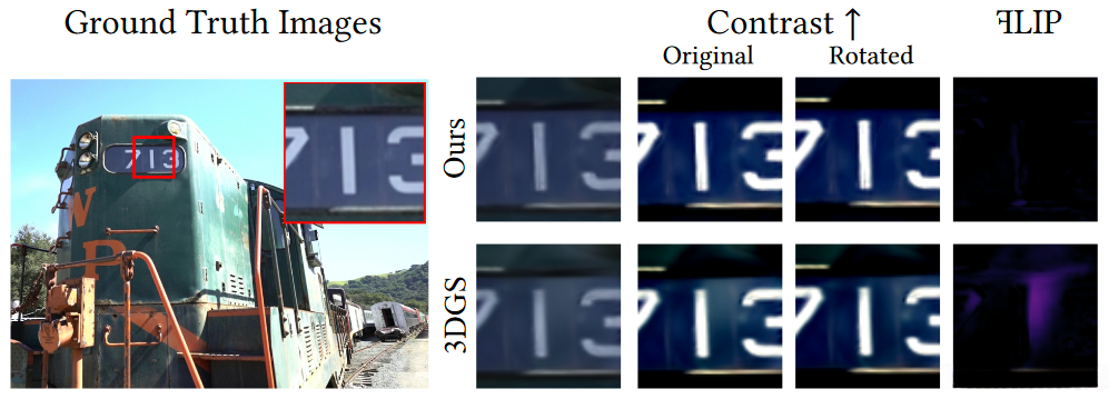 We slightly rotate test set views, and 3DGS’s results are significantly less consistent compared to our results. We increase contrast for zoomed-in views and include a F LIP view for a better comparison.