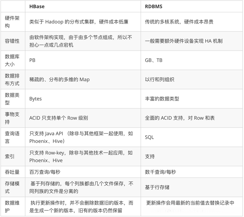 Hadoop HDFS为HBase提供了高可靠性的底层存储支持,Hadoop MapReduce为HBase提供了高性能的计算能力,Zookeeper为HBase提供了稳定服务和failover机制。Pig和Hive还为HBase提供了高层语言支持,使得在HBase上进行数据统计处理变的非常简单。 Sqoop则为HBase提供了方便的RDBMS(关系型数据库)数据导入功能,使得传统数据库数据向HBase中迁移变的非常方便。