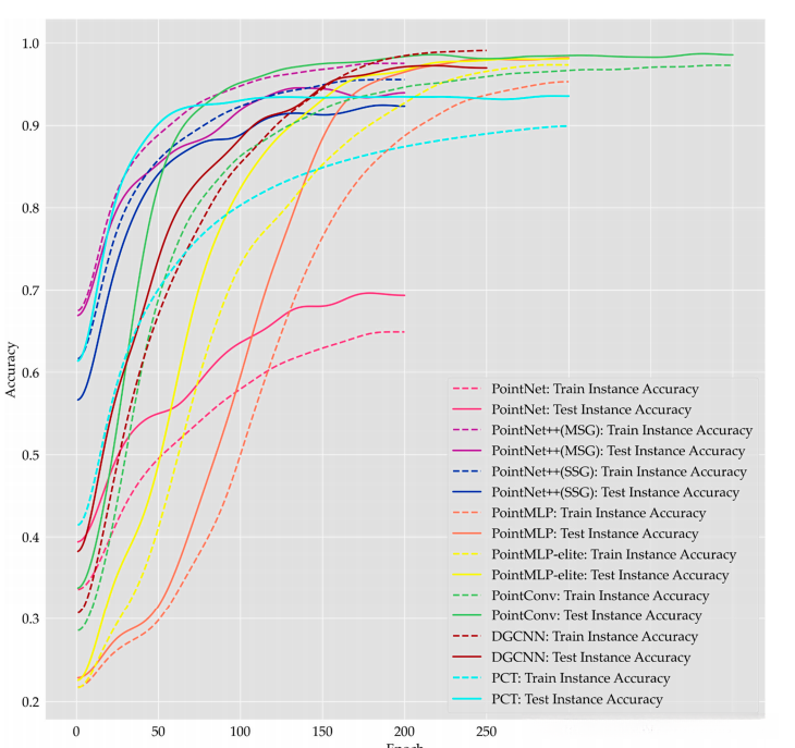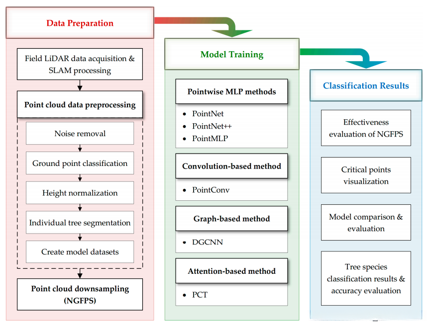 为了充分挖掘点云深度学习方法在单个树种分类方面的潜力,我们进行了以下实验。提出了一种结合非均匀网格和最远点采样方法的点云数据降采样策略。 采用四种不同类型的点云深度学习方法,包括点向MLP、基于卷积的模型、基于图的模型和基于注意力的模型,对单个树点云进行树种分类和识别。我们的实验共纳入了PointNet、pointnet++、PointMLP、PointConv、DGCNN和点云变压器(PCT)等6个点云深度学习模型。