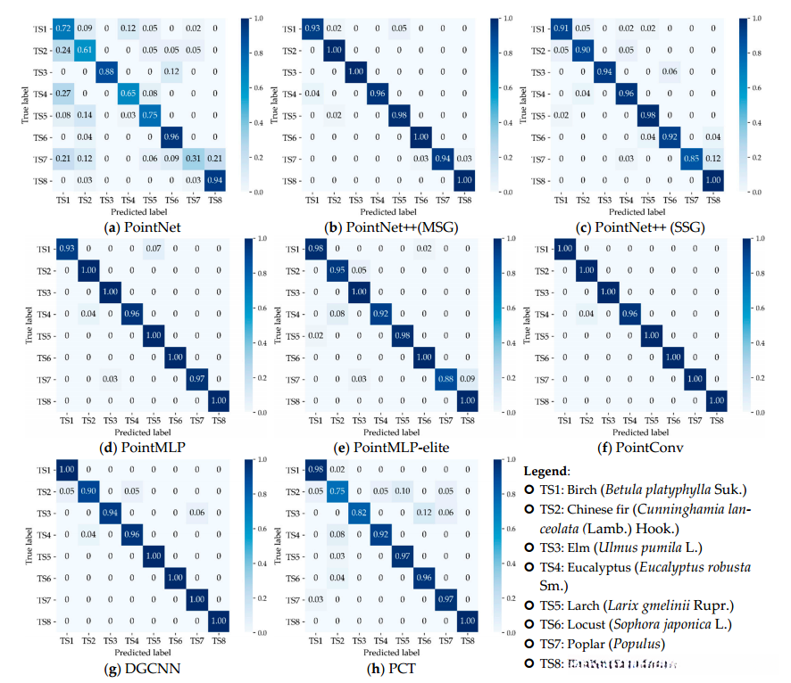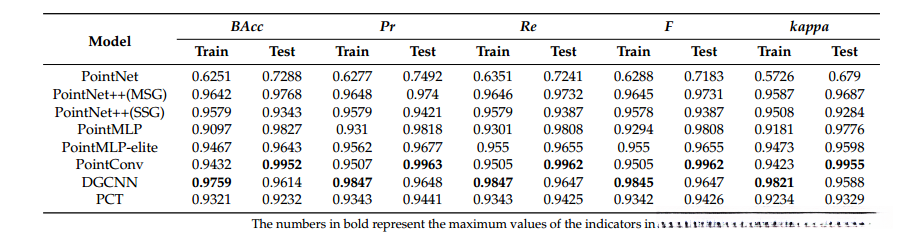 **** 总结了所有模型在训练集和测试集上的最终分类结果,并提供了表中所有模型的评估指标。如表中所示,PointNet对所有结果具有最低的评估指标。在测试集的结果评估中,PointConv模型在所有评估度量中具有最高的值。作为最近提出的最先进的(SOTA)逐点MLP方法,PointMLP在测试集中的所有分类评估指标中排名第二。所有模型在测试数据集上的分类结果的混淆矩阵如图所示,与表的结果相印证。