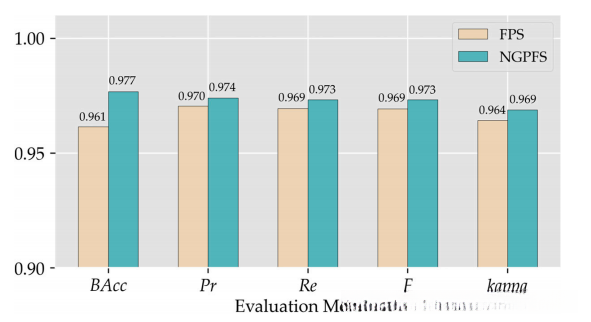 使用PointNet++模型对FPS和NGFPS方法的样本数据进行了深度学习训练和测试实验。我们在测试数据集上记录了FPS和NGFPS方法的模型评估指标。所有这些结果如图所示。从图中可以看出,使用NGFPS方法的结果中,所有模型评价指标都是最优的。
