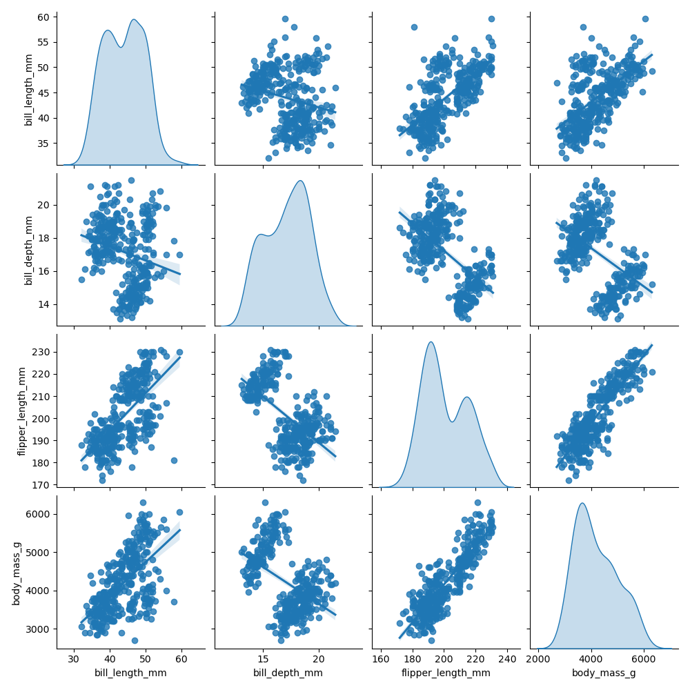 >>> sns.pairplot(df, kind='reg', diag_kind='kde')
