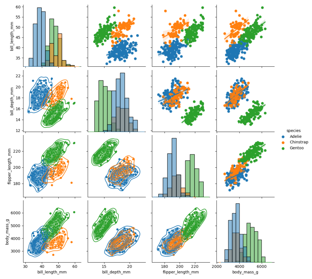 在pairplot函数中,我们可以分别设置非对角线区域和对角线元素位置的呈现方式,并附上示例