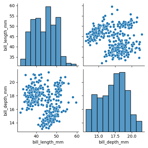 >>> sns.pairplot(df, x_vars=['bill_length_mm', 'bill_depth_mm'], y_vars=['bill_length_mm', 'bill_depth_mm'])