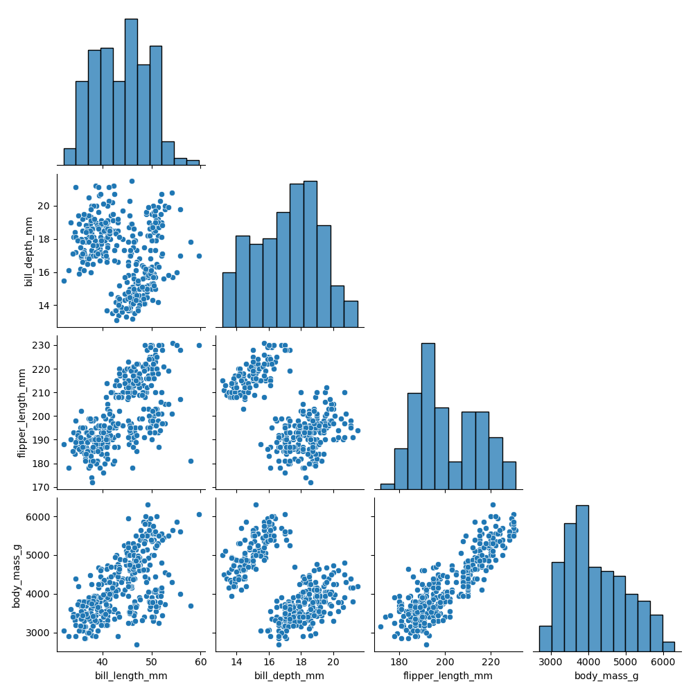 >>> sns.pairplot(df, corner=True)