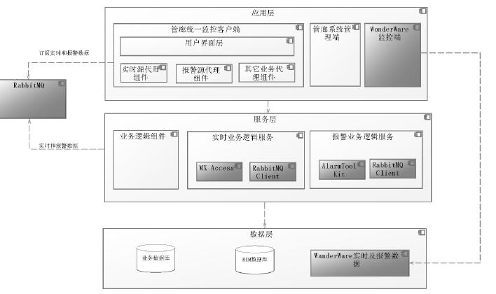 服务层是系统的是整个业务逻辑中心, 本层整体上也采用分层模式进行划分,将它分为接口层、服务层和数据访问层。 该层被分为业务逻辑组件、 实时业务逻辑服务和报警业务逻辑服务。 业务逻辑组件主要实现了管廊统一监控客户端和统管端的业务逻辑; 实时业务逻辑服务实现了将 Wonderware 平台实时监控数据通过 RabbitMQ 转发到客户端; 报警业务逻辑服务与实时业务逻辑服务类似,不过它转发的报警信息。