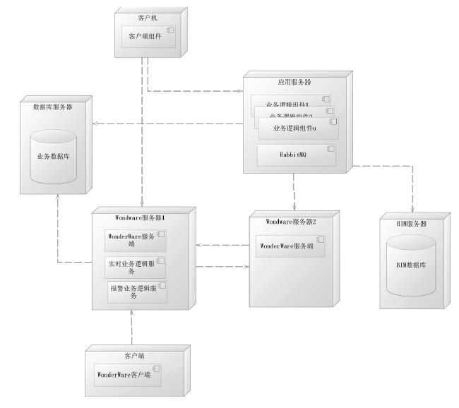 智慧管廊综合监管平台服务端包括 Wonderware 服务器 2 台、数据库服务器 1 台、BIM 服务器 1 台、应用服务器 1 台。 2 台 服务器都安装 服务端,组成分布式冗余服务端。其中 1 台服务器还需安装实时业务逻辑服务和报警业务逻辑服务, 为自主研发的智慧管廊官网客户端提供实时和报警数据; 数据库服务器安装 SQLServer 2012 数据库;BIM 服务器安装 BIM 数据服务。