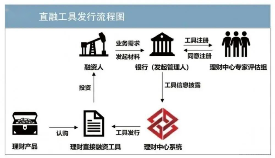 理财直接融资工具的特色体现在其'直接融资'机制上。这种机制是指商业银行作为发起管理人设立专项基金,并直接投资于单一企业的标准化债权融资工具。该产品仅限于银行理财管理计划投资者,在中债登的理财直接融资工具综合业务平台进行交易和流转操作。在资产端运作的同时,'非标转标'功能得以实现,资金端对应的交易方即为开展理财业务的投资方——理财管理计划机构。理财管理计划机构是由商业银行发起设立的,通过从理财客户处吸收资金后,将投资资源分配至理财直接融资工具、货币市场工具以及银行间市场债券等项目中(如图所示)。与此同时,理财产品及其份额均需通过统一的登记托管结算机构完成发行、登记、托管及交易结算等环节,并通过'综合业务平台'(简称'综合业务平台')进行信息发布