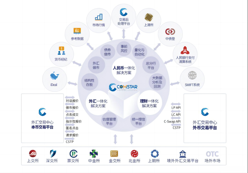 目前在中国市场较为普及的金融市场资金交易系统主要由外汇交易中心推出Comstar产品。作为中国外汇交易中心旗下公司ComStar自成立以来专注于通过科技创新提升银行间市场成员的服务水平。该产品整合了AI技术和大数据分析工具,在监管环境变化中提供了包括做市自动化报价工具、跨资产量化策略交易平台以及大数据分析及回测平台等多种创新服务,并结合结构性存款解决方案满足多样化的市场需求。旨在为用户提供全面的金融市场基础设施服务,并构建覆盖资金业务的一站式解决方案方案,请参考图09-04。