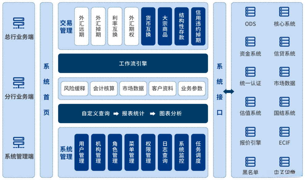- 前台:涵盖模板化管理流程、基础交易记录创建以及存款产品与衍生品自动分类处理;实现了完整的损益计算体系以及风险评估框架;提供多维度的数据分析功能以满足监管要求