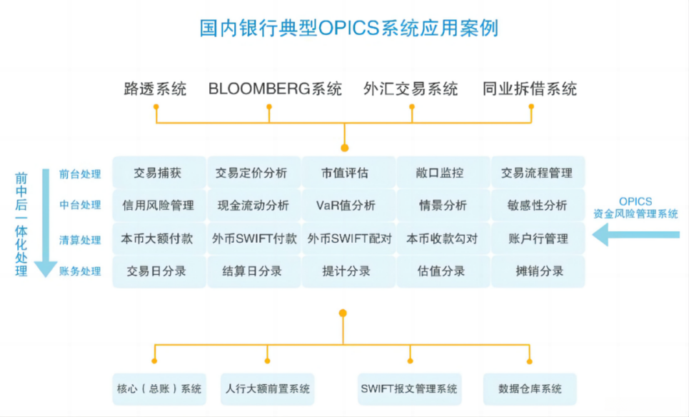 Opics Plus是一款在资金管理领域具有领先地位的综合管理平台。它不仅包含货币市场、外汇交易以及衍生品市场的全生命周期运营机制,并且自交易启动至清算结算及会计核算等环节均有完整管控流程。该平台采用前后台全面整合方案,在不同资产类别间实现了高效联动管理能力。目前已有超过30家中国银行部署了该系统,并其中超过20家机构采用该平台实现了本外币资金业务的全面一体化管理流程(如图09-03所示)。