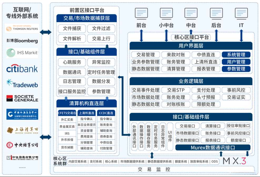 Murex推出的MX.3系统提供稳定且模块化的设计方案,在各类资产交易、风险管理及处理方面均能发挥重要作用。该系统可实现本地部署(由客户自行管理),也可通过Murex提供的云服务实现云端部署(由其负责管理)。MX.3凭借开放性特点,在各个细分市场中帮助机构加速技术转型,并有效降低总拥有成本(TCO)。客户可通过开放 RESTAPI 库进行创新性操作,并获得额外定制服务以提升个人能力。在严格的监管环境中 MX.3持续进化以适应更高标准要求。作为云预设解决方案 MX.3特别适合企业级风险管理需求它使风险管理人员能够在合规领先的同时轻松实现监管合规性保障机构有效应对日益严苛的要求 MX.3为企业级风险管理提供全面解决方案涵盖市场、信用及流动风险等多种领域从而实现内部与监管层面的合规需求同时 MX.3还提供了实时限额及风险敞口监控功能涵盖内部市场风险交易账户基本审查估值调整等关键指标为机构提供全方位风险管理支持方案同时支持交易对手信用风险标准化方法以及信用风险与初始保证金计算等内容 MX.3专为买方机构设计打造了一个集成统一平台让用户全面掌握投资生命周期从组合管理到合规监控都能得到有效覆盖并实现了对投资组合、合规管理、市场风险等全方位控制及高透明度报告生成能力 Murex通过预置接口与第三方平台之间建立直接连接从而帮助客户降低部署成本并缩短上线时间这些接口覆盖了市场数据参考数据源交易执行及清算结算等完整业务流程同时囊括了跨资产类别监管报告生成等功能 Murex提供的基于标准化集成技术的框架允许客户与合作伙伴开发定制化接口支持多模式数据转换灵活配置业务流程并根据实际需求选择合适的金融消息传递格式如SWIFT FpML FIX等 Murex还利用Kafka MQ JMS REST WebServices SFTP JDBC等标准技术和中间件构建外部连接以确保系统的高效稳定运行