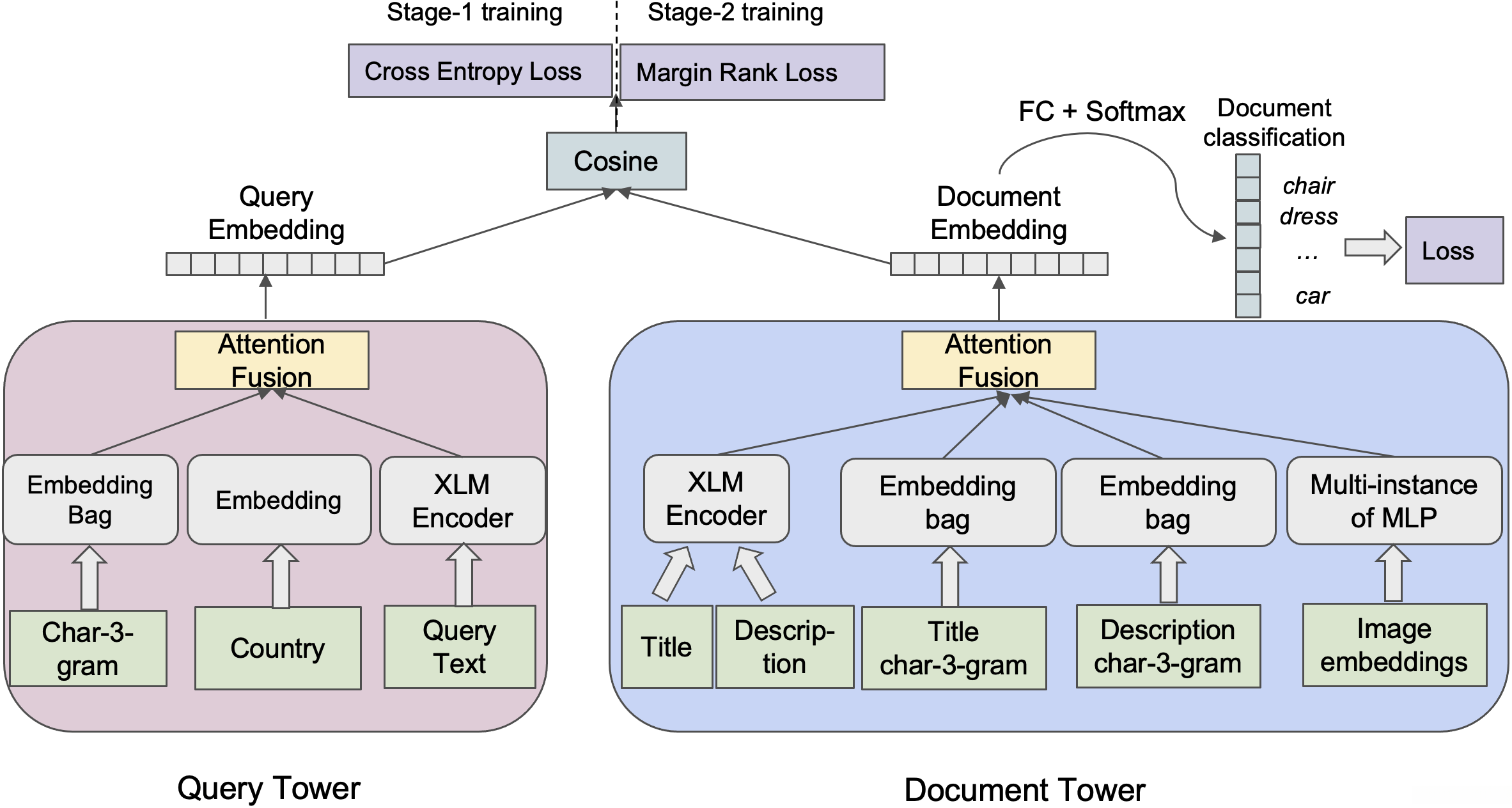 该系统采用一种基于查询与产品相似度的方法进行研究与开发。该方法综合运用多种模态特征,并借助XLM编码器提取文本信息,在弱监督学习框架下进行训练。研究发现其性能优于Facebook提出的基准方案。此外该系统支持基于向量检索实现查询到产品的系统,并在排序阶段作为辅助特征使用以提升排序效果