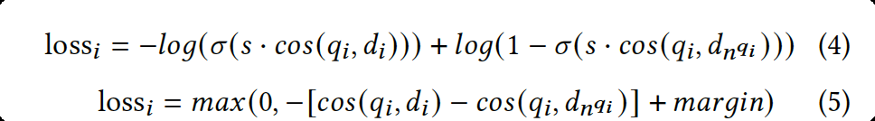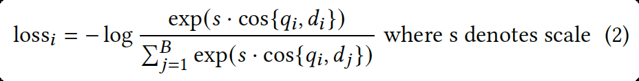 2)批量负样本采用查询与商品 embeddings 的点积构建余弦相似度矩阵;主对角线元素代表了正样本对之间的相似度得分;每行记录了每个Query与其对应的全部Products之间的相似度分数;每列则反映了各个Product与所有Query之间的相似度分数;对于每一个Query来说,在其对应的行中仅有一个非零分值(即该Query自身的正匹配),其余均为零分(即Negative Samples);该研究采用带有缩放因子的比例多分类交叉熵损失函数作为优化目标,在实验中发现缩放因子有助于提升模型收敛速度