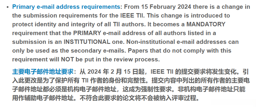 - **Primary e-mail address requirements: 自2024年2月15日起,《IEEE工业电子学汇刊》的提交要求将发生变更。这一变更是为了保护所有提交内容中列出作者的身份和完整性。从今往后,《IEEE工业电子学汇刊》对所有列出在某一篇论文中的作者而言,其主要电子邮箱地址必须指定为机构性电子邮箱地址;仅能作为次要电子邮箱地址使用的只能是非机构性电子邮箱地址。不符合此要求的文章将不会进入审稿流程。