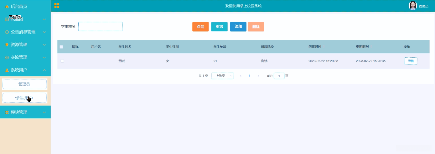 Springboot掌上校园系统APP中的管理员在"系统用户管理"菜单中可以对注册的学生用户和管理人员进行管控。界面如下图4-11所示。