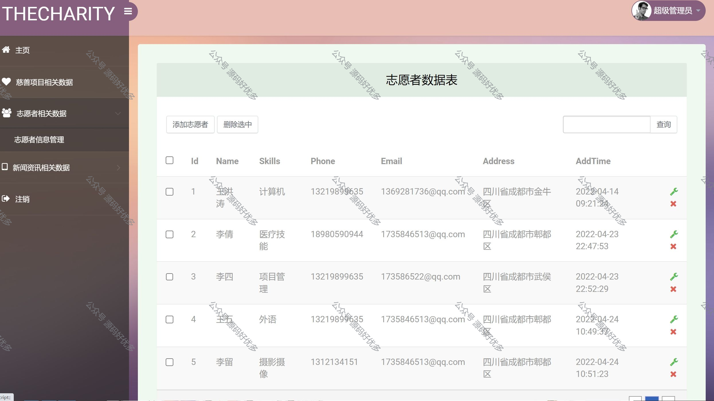 (5)志愿者管理:对志愿者真实名字手机号技能年龄住址性别进行增删改查,管理和控制志愿者信息。