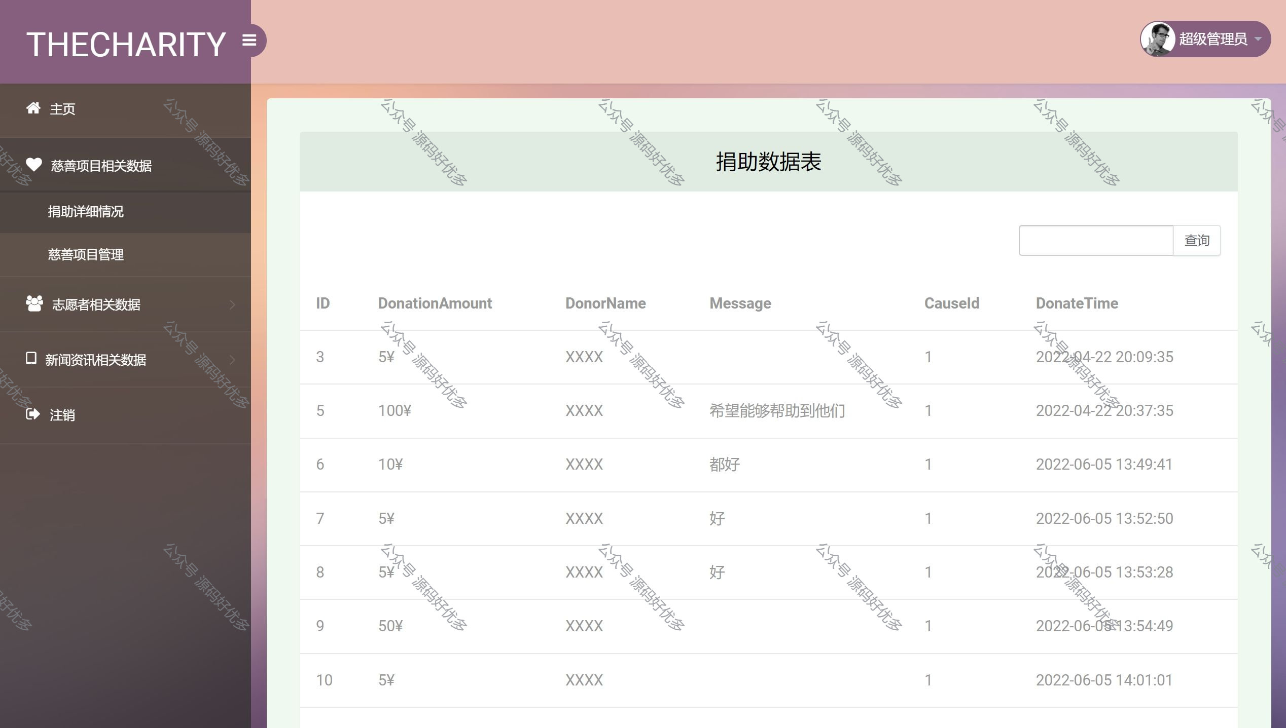 (3)公益项目管理:管理员可以添加、删除、修改慈善项目信息,查看慈善项目列表,对物品进行管理和控制。例如,管理员可以查看每个慈善项目的详细信息、交易记录等,并可以对慈善项目的交易情况进行审核和管理。