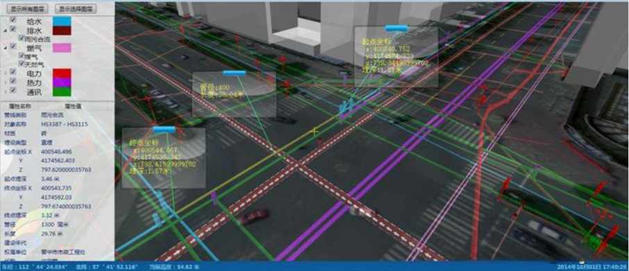 通过结合管线图,在关键节点布置摄像头(膨胀节)。于管道节点处安装压力传感器及漏水感应报警装置,并持续监测水压并发出预警。三维可视化系统能够精确识别传感器的位置。当触发警报时,则能迅速准确定位问题所在并实时显示相关管路信息:包括压力值、直径尺寸以及材料类型。为了便于维修人员快速处理问题,在发生爆管时及时配置爆管连锁装置用于自动关闭供 pumped 系统
