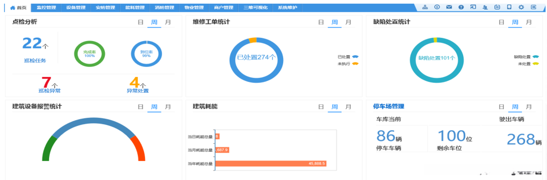 综合评估:涵盖建筑能耗总量、设备运行异常数据统计、质量缺陷处理记录汇总、日常巡检数据分析、维修服务记录整理以及停车场地施工业务监控等多个维度。