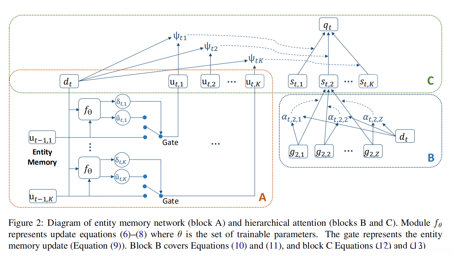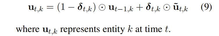 作者在常规的encoder-attention-decoder以及copy mechanism下,针对实体生成,在decoder过程中不断更新实体,更新的过程采用门机制,类似于LSTM;具体如下公式(9),比如有k个entity,对每个entity,在decoder time t,新U(t,k)更新是由δ(t,k)确定,δ(t,k)接近1,则U(t-1,k)对应的值就会被更新,接近0则保持前一时刻的值不变;