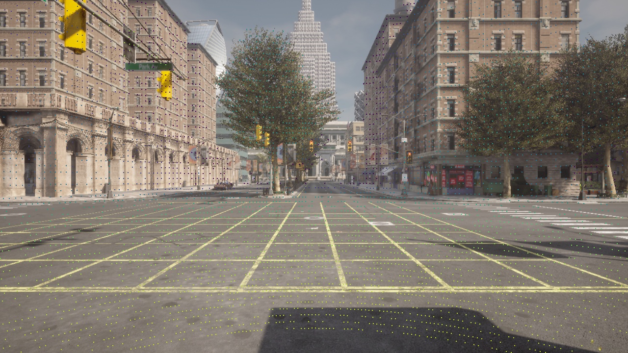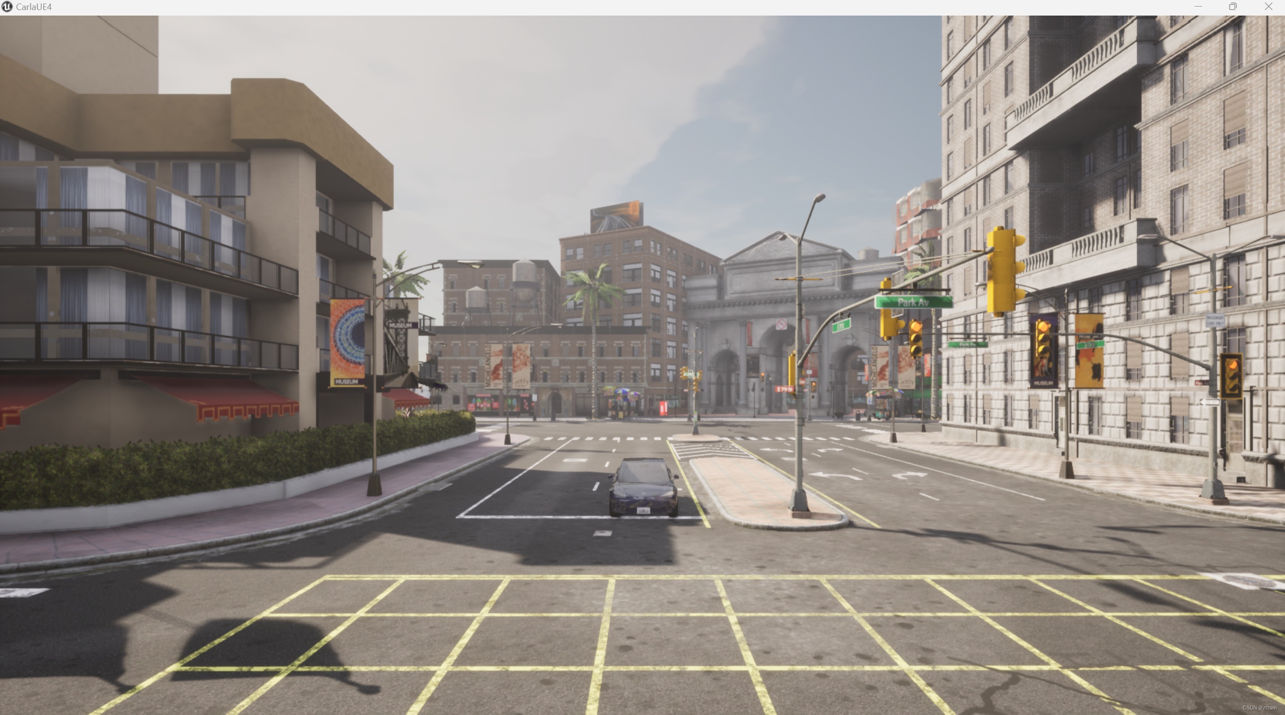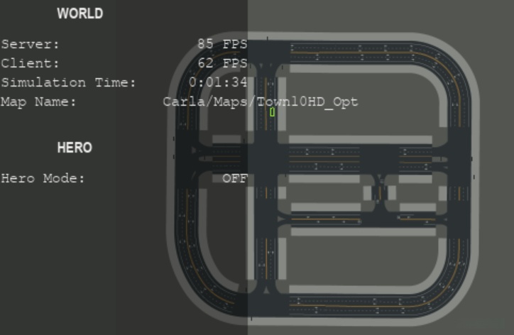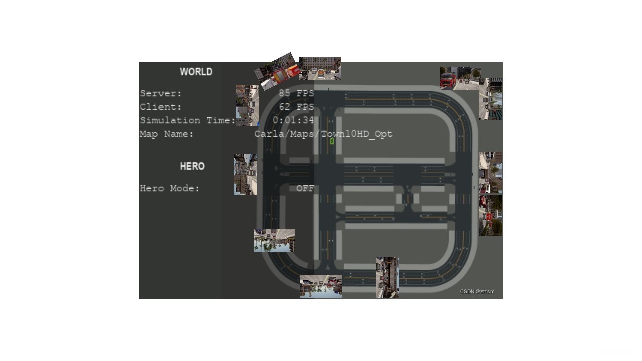 Carla9.14版本提供的的是Town10HD俯视图,如下图所示,附加了在一些比较好视角下的采集图像。