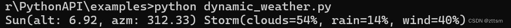 首先main()中传参:端口、天气变化速率speed_factor=1.0—>更新频率update_freq = 0.1/speed_factor。创建client,访问世界,获取天气world.get_weather() 。