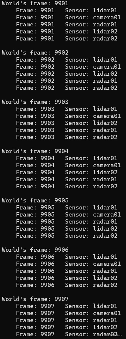 获取world时刻world.get_snapshot().frame用来保证多个传感器的同步 。