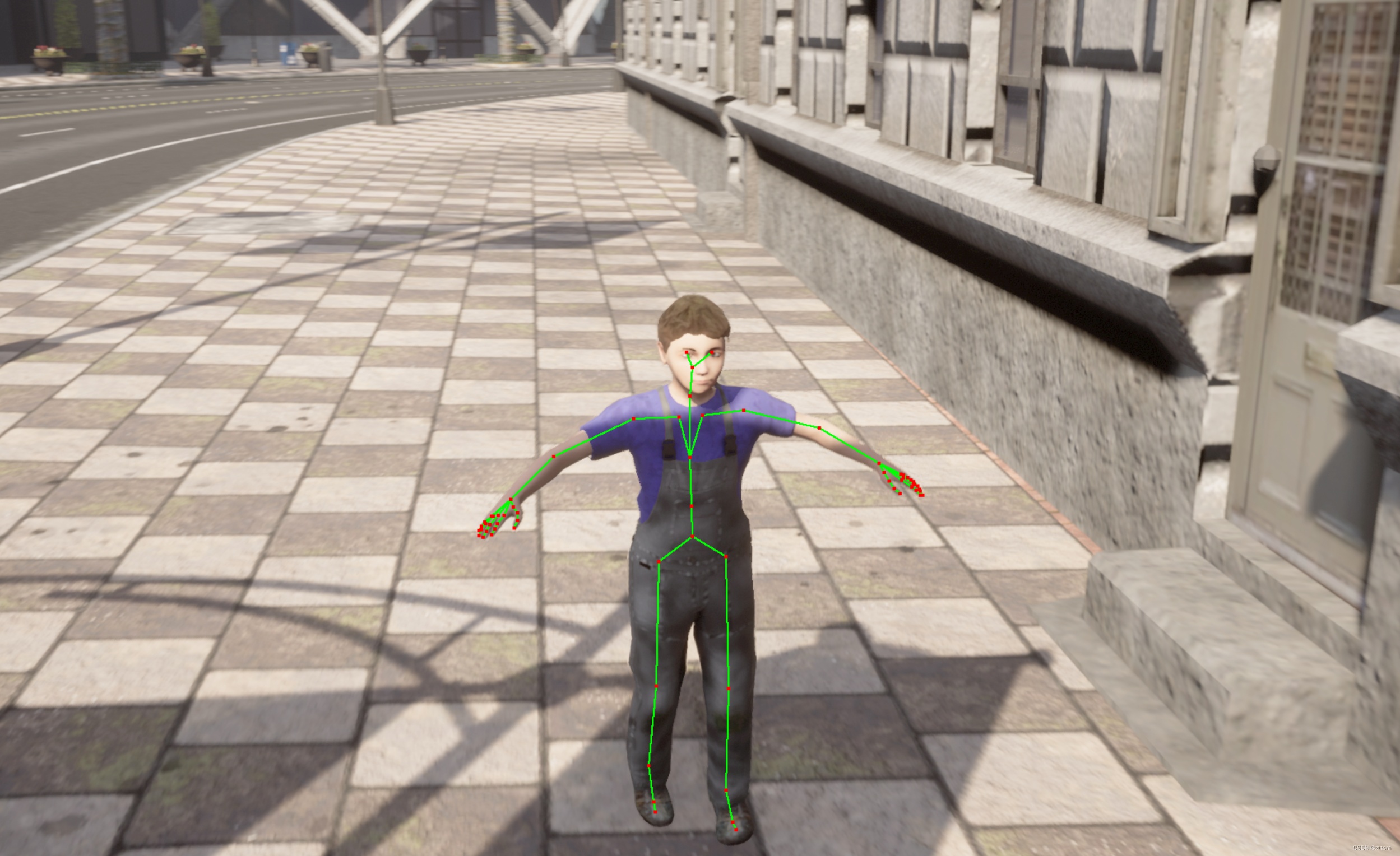 根据骨骼节点的名字及先验的相邻关系,绘制骨骼节点points_2d之间的连线 (绿色),调用CarlaSyncMode类draw_skeleton(buffer, image_w, image_h, boneIndex, points_2d, (0, 255, 0), 2),修改buffer中对应位置像素点的color值。