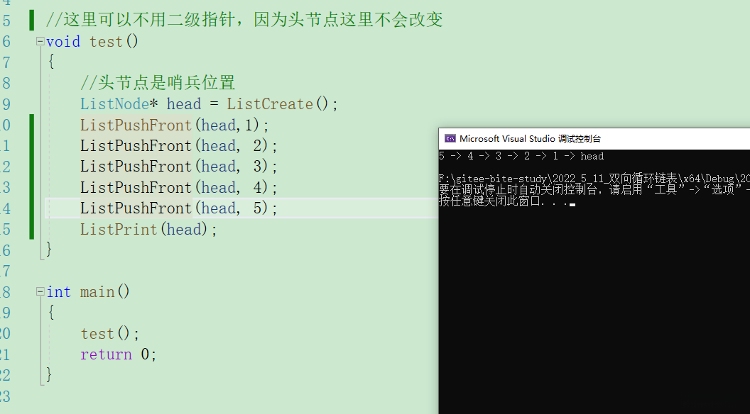 在前面部分实现了链表的插入功能,在其原因在于,在头部进行链表插入时可以直接利用已有的函数。这里的链表头结点位于哨兵位之后的一个位置,在这种情况下将该节点传递进来等同于在其头部进行插入操作。