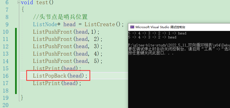 还是跟尾插一样,删除哨兵位前面的节点就是链表的尾部删除。