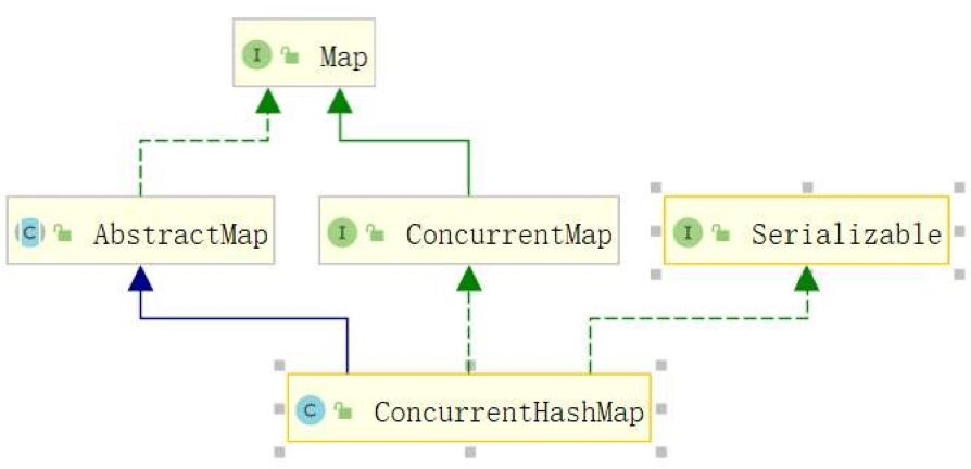 它们所处的包有所不同。具体来说,“ConcurrentHashMap”位于java.util.concurrent包中,“HashMap”则位于标准库中的java.util包内。请参见下图以获取更详细的实现信息。