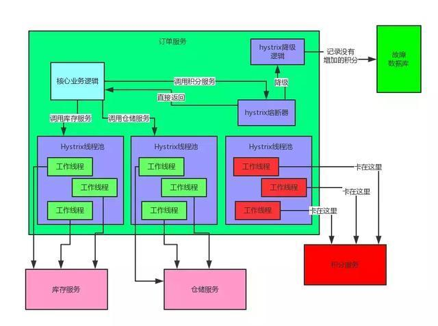 当然会导致订单服务里那个用来调用积分服务的线程都卡死不能工作了啊!但由于订单服务调用库存服务、仓储服务的这两个线程池都是正常工作的,所以这两个服务不会受到任何影响。