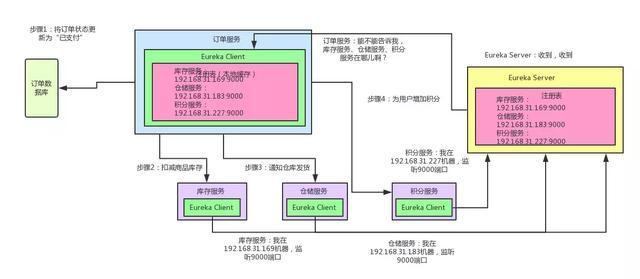 这时如果订单服务想要调用库存服务,不就可以找自己本地的Eureka Client问一下库存服务在哪台机器?监听哪个端口吗?收到响应后,紧接着就可以发送一个请求过去,调用库存服务扣减库存的那个接口!同理,如果订单服务要调用仓储服务、积分服务,也是如法炮制。