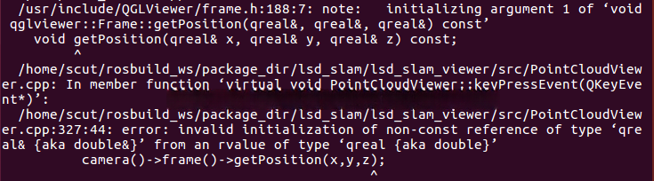 在 Qt 框架中定义为 qreal 的数据类型,在 Ubuntu 14.04 系统环境中等同于 float 类型;然而到了 Ubuntu 16.04 系统环境中,则被修改为 double 类型。错误信息指出:变量 x、y、z 的数据类型为 float 类型;而 getPosition 函数的形式参数却被指定为其形参数据类型为 qreal(相当于 double),因此这些 x、y、z 的数值会被自动转换并暂存在一个临时变量里;这样就会导致 getPosition 函数接收的是一个右值而非常数引用对象;但由于该右值无法初始化非const引用对象而产生错误。