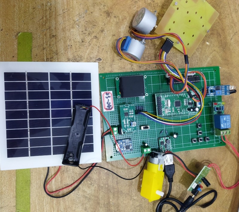 本系统由STM32F103C8T6单片机核心板、1.44寸TFT彩屏、太阳能板、稳压电路、锂电池充电保护TP4056、升压稳压模块、光敏采集电路、步进电机及ULN2003驱动电路、按键电路、红外测距传感器、电机控制电路组成。