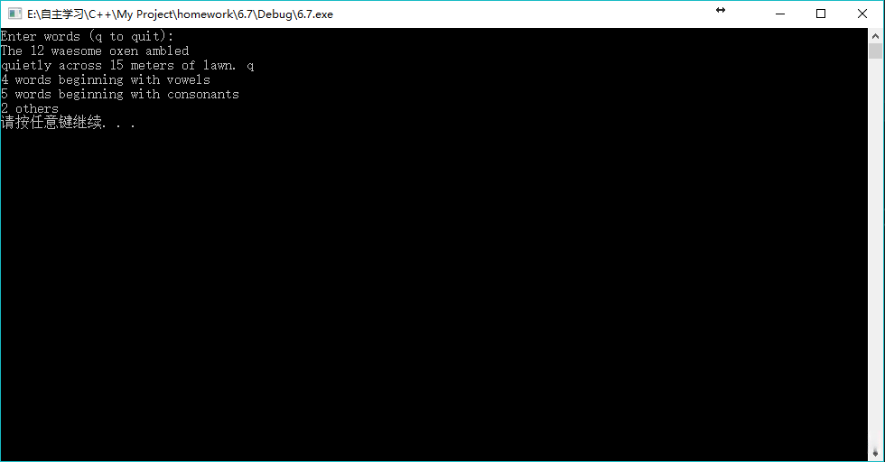 在这里我使用string对象来储存输入的单词,因为string对象可以识别空格和回车作为分隔。而对于判断部分,我们只需要首先对input[0]这第一个字符使用isalpha()函数,然后使用一个if就可以了,判断这第一个字符是不是元音字母,然后连续使用两个else就可以了。另外注意使用“q”来停止输入。