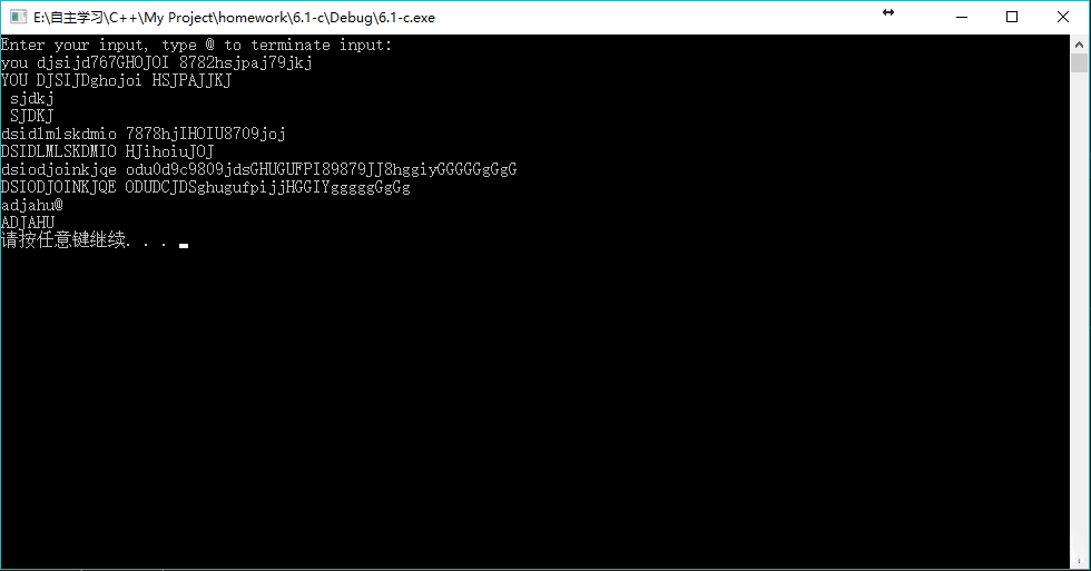 本题主要需要完成3个功能,第一是对于输入控制,遇到特殊字符结束,第二是将所有输入除去数字之后显示出来,第三是大小写之间的转换。对于第一个功能,可以设计一个循环输入,判决条件就是输入不等于@符号,判决条件成立,才进行后续操作并要求继续输入,否则就不会进行任何操作。对于第二个功能,有很多种解决方案,这里我使用的是isdigit()函数,既然题目中要求使用cctype的函数系列,那么我们就可以使用isdigit()函数来判断是否是数字,如果不是才输出,这样是数字时就不会输出了。对于第三个功能,直接使用cctype中的islower()函数+toupper()函数和isupper()函数+tolower()函数就可以了。