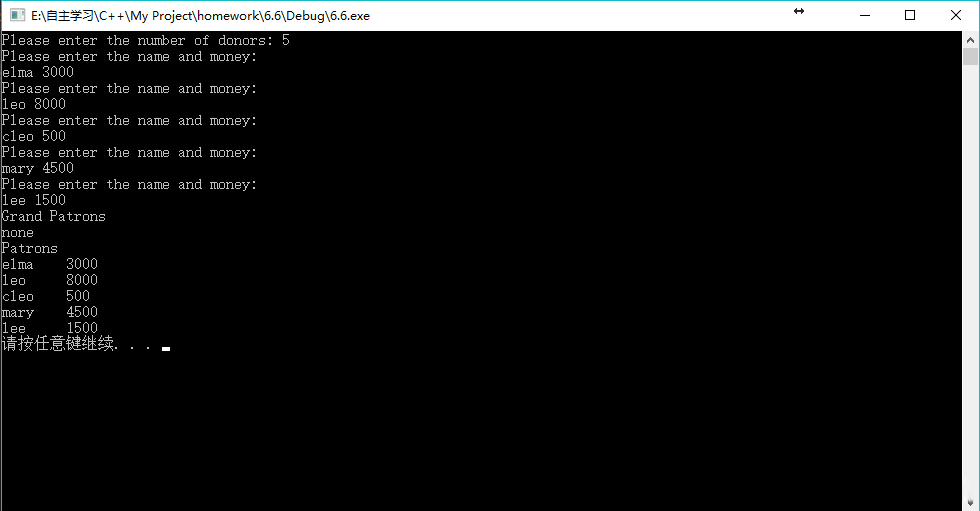 6. 编写一个程序,记录捐助给“维护合法权利团体”的资金。该程序要求用户输入捐赠者数目,然后要求用户输入每一个捐献者的姓名和款项。这些信息被储存在一个动态分配的结构数组中。每个结构有两个成员:用来储存姓名和字符数组(或string对象)和用来存储款项的double成员。读取所有的数据后,程序将显示所有捐款超过10000的捐献者的姓名及其捐款数额。该列表前应包含一个标题,指出下面的捐款者是重要捐款人(Grand Patrons)。然后,程序将列出其他的捐款者,该列表要以Patrons开头。如果某种类型没有捐献者,则程序将打印单词“none”。该程序只显示这两种类别,而不进行排序。
