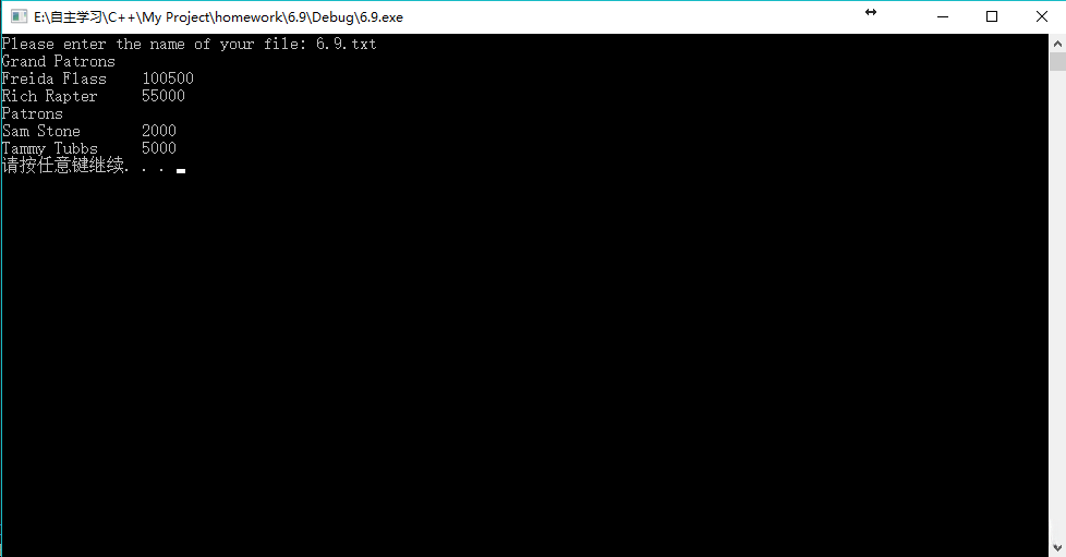 9. 完成编程练习6,但从文件中读取所需的信息。该文件的第一项应为捐款人数,余下的内容应为成对的行。在每一对中,第一行为捐款人姓名,第二行为捐款数额。即该文件类似于下面: