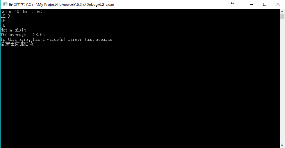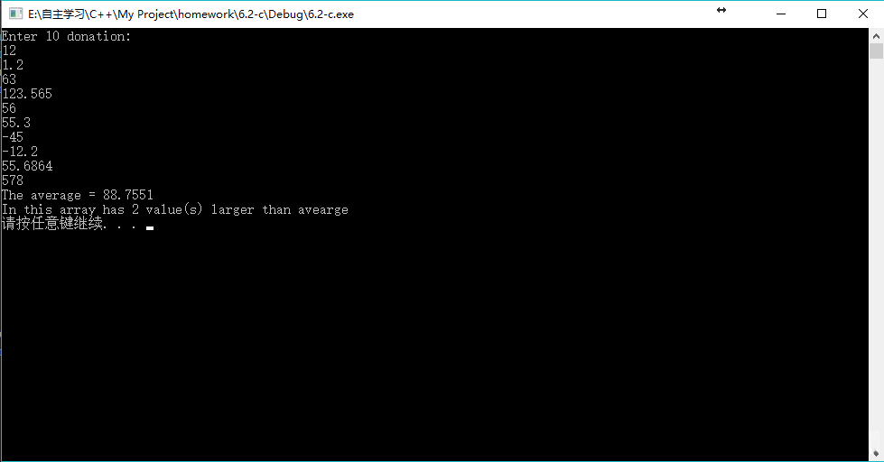 2. 编写一个程序,最多将10个donation值读入到一个double数组中(如果您愿意,也可使用模板类array)。程序遇到非数字输入时将结束输入,并报告这些数字的平均值以及数组中有多少个数字大于平均值。