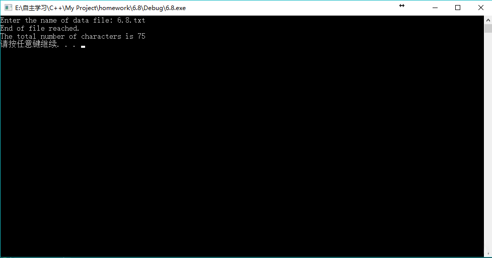 本题要求处理文件,所以必须加入fstream头文件,这个头文件中的ifstream和ofstream是用来打开和输出文件的,其中还有很多函数,在这里我用到了.open()、.is_open()、.good()、.eof()、.close()这几个函数。.open()函数是打开文件,比如.open("6.8.txt")就会打开名为“6.8.txt”的文件了;.is_open()函数时用来判断打开文件是否成功,例如.is_open("6.8.txt"),有可能是该程序的目录下找不到名为“6.8.txt”的文件,那么.is_open()函数就会返回false了;.good()函数是指读取成功;.eof()函数是用来判断是否读取到了最后;.close()函数是用来关闭打开的文件。这里我写的程序是请求用户输入文件名,这样该程序就可以用来打开任意文件,只要在该程序的目录下存在该文件就可以。