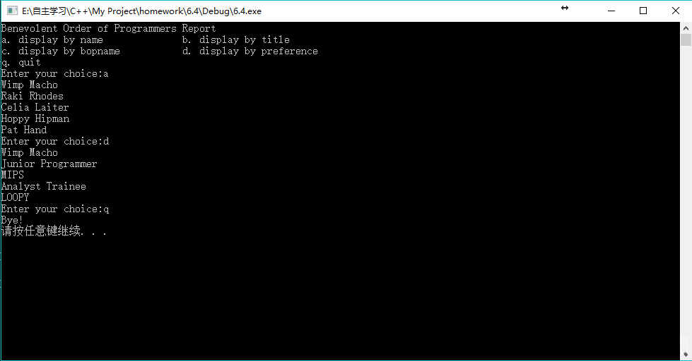 注意,“display by preference”并不意味着显示成员的偏好,而是意味着根据成员的偏好来列出成员。例如,如果偏好号为1,则选择d将显示程序员的头衔。该程序的运行情况如下: